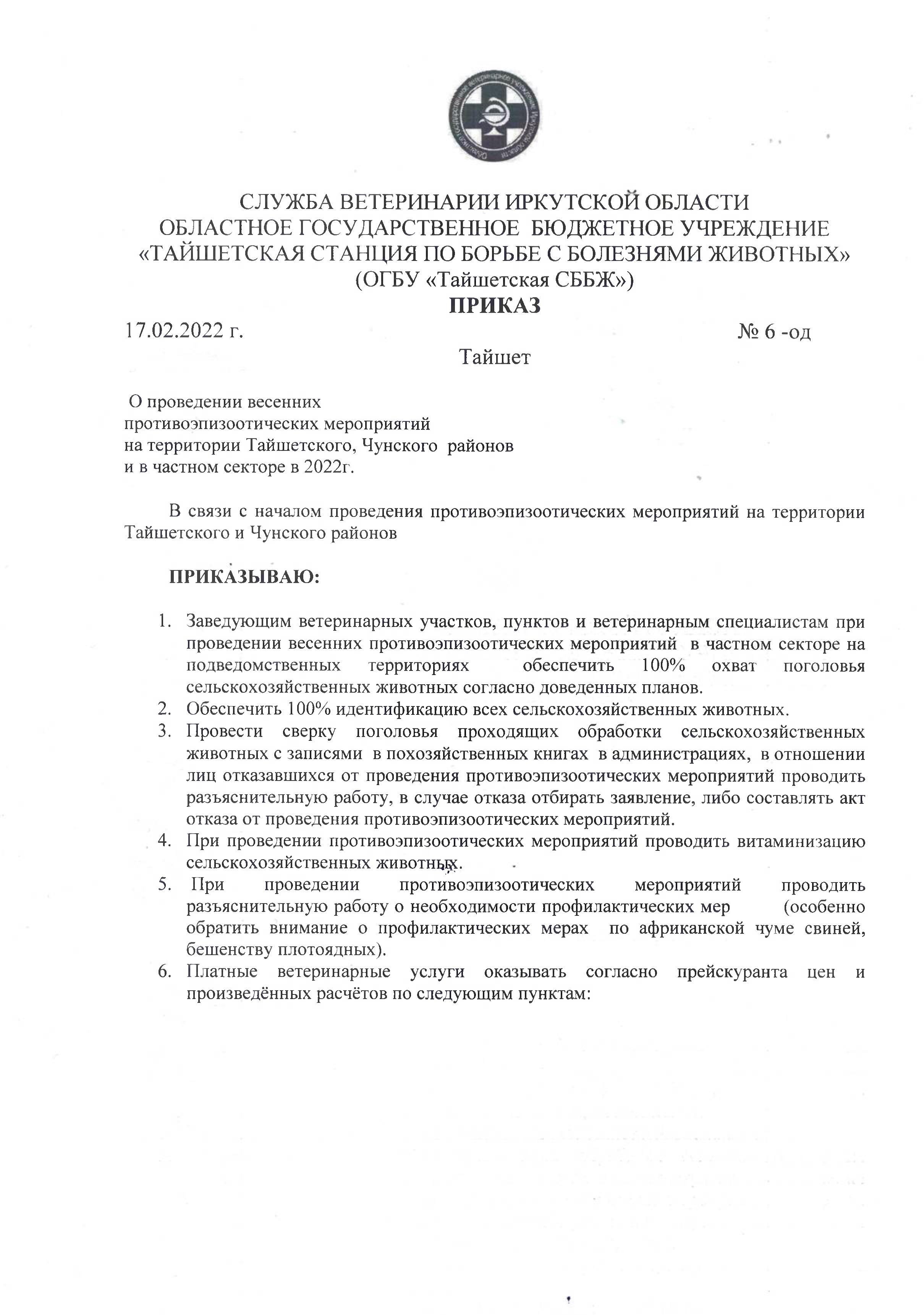 О проведении весенних противоэпизоотических мероприятий на территории Тайшетского, Чунского районов и в частном секторе в 2022 г.